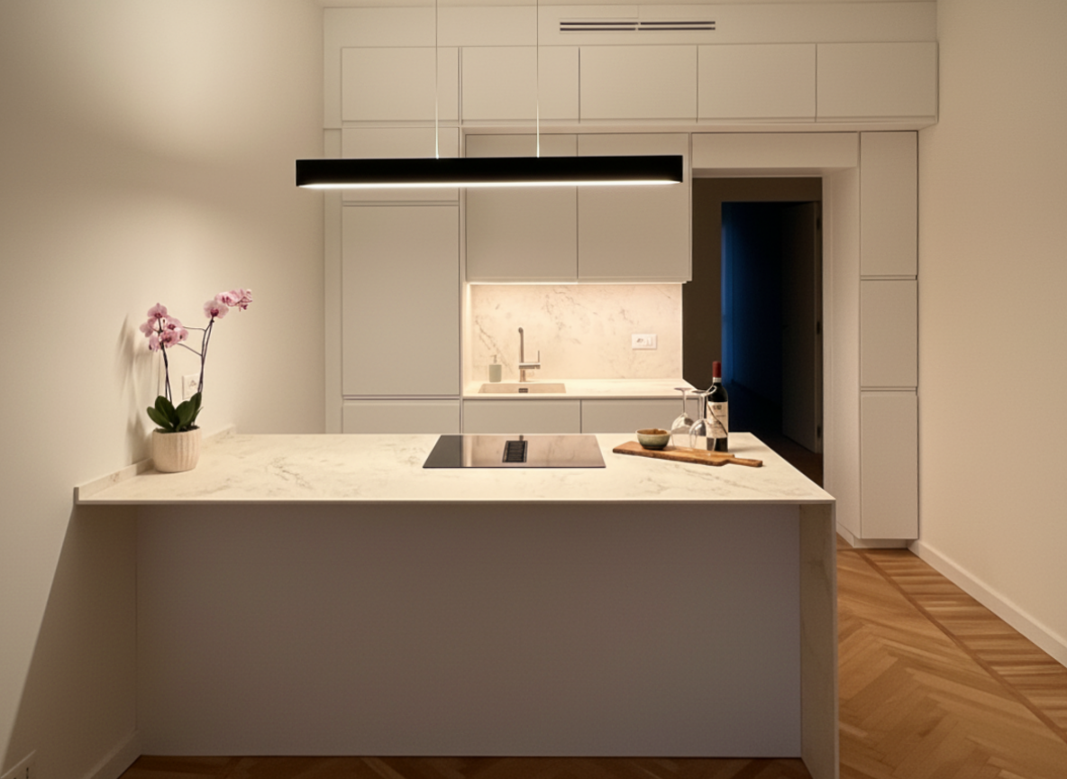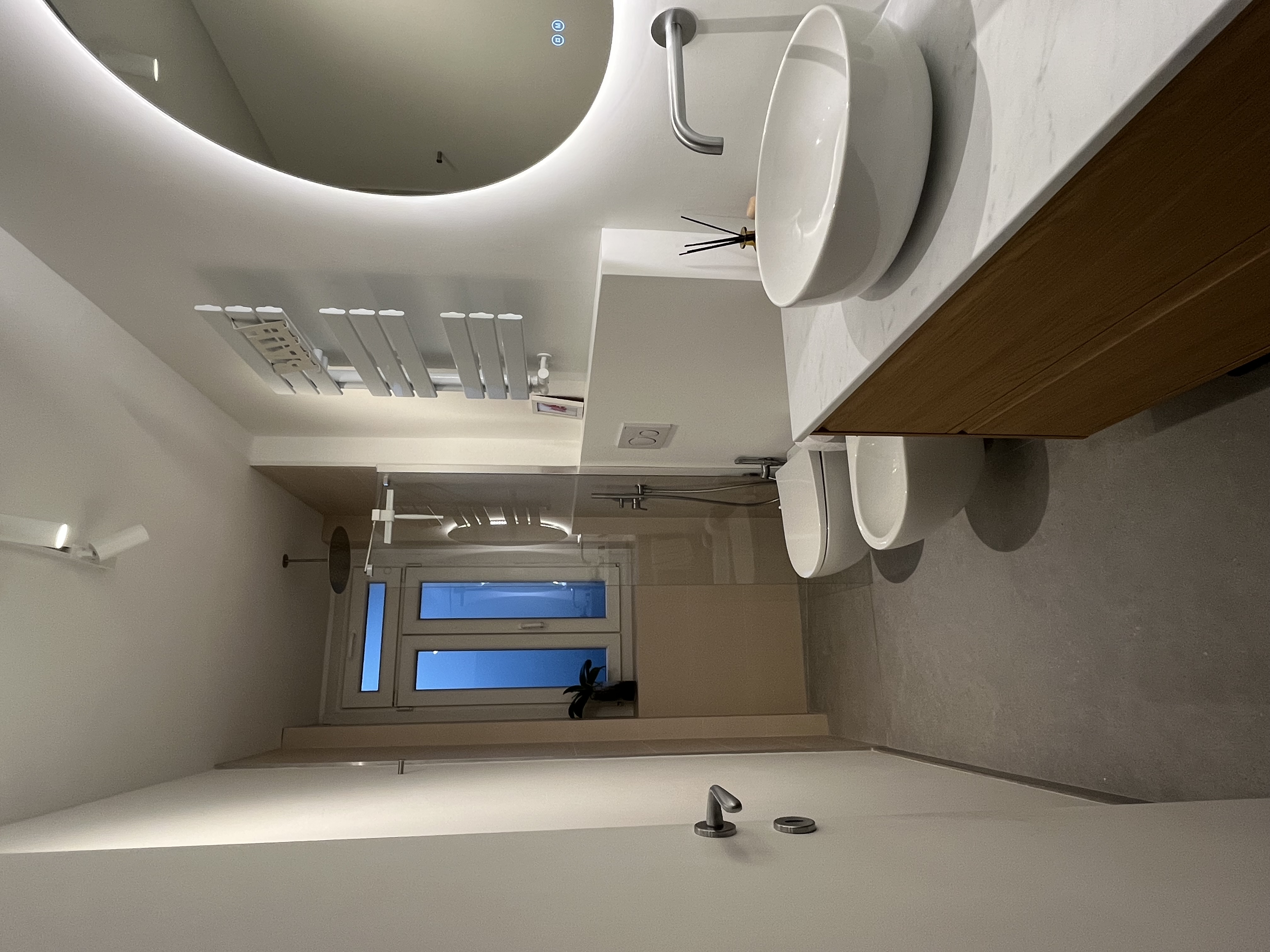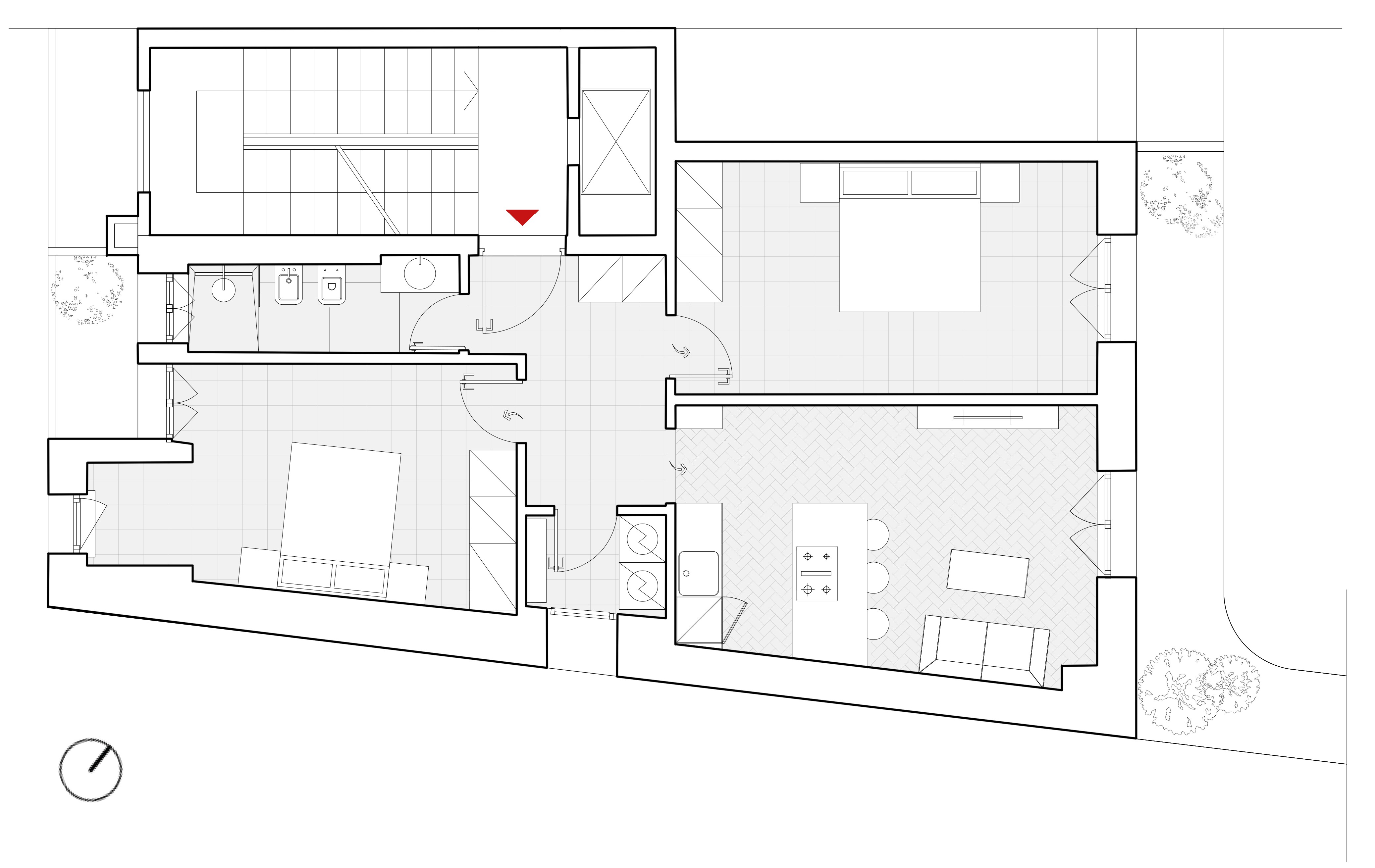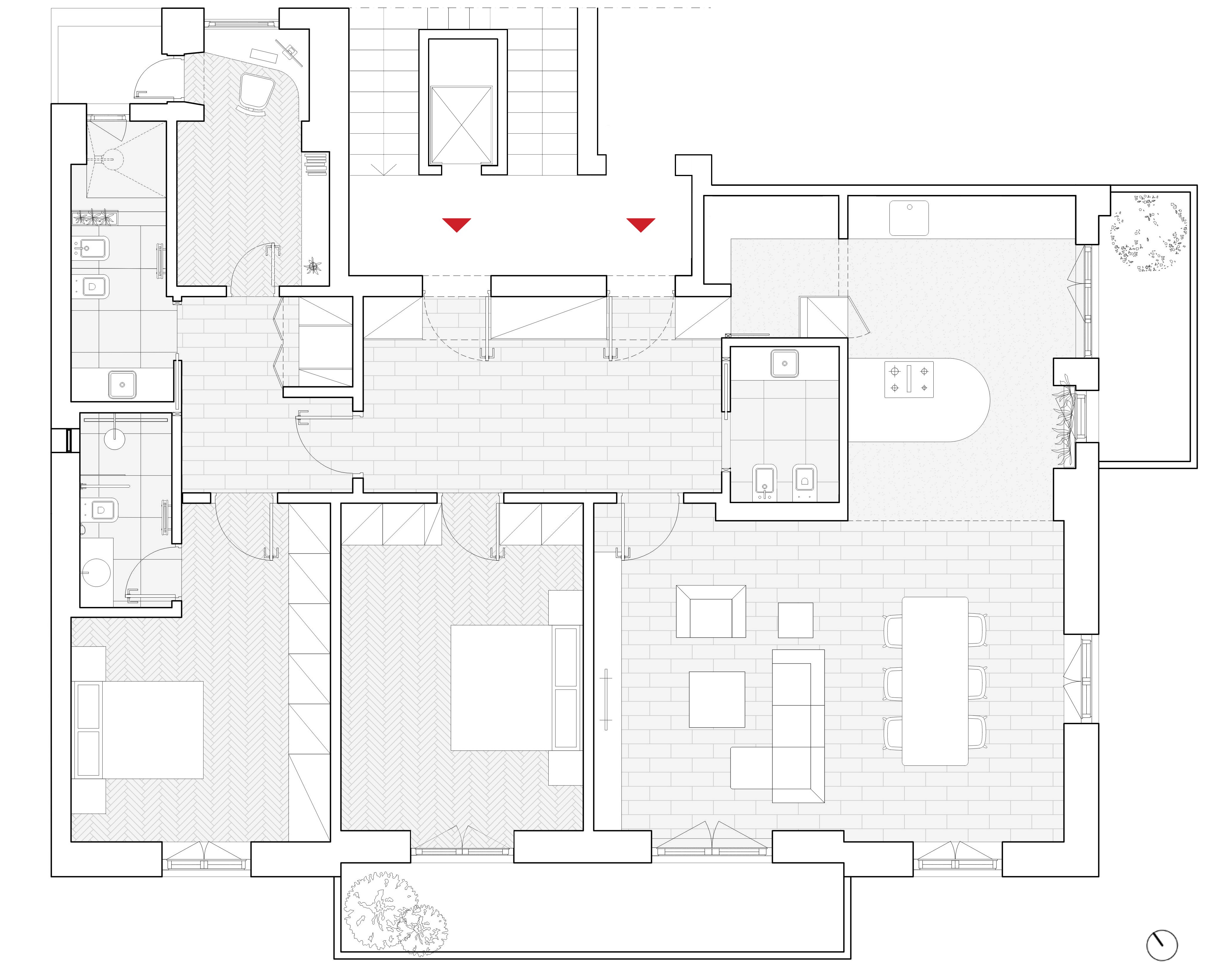 A thoughtful renovation that reconfigures the internal layout without major demolition works, creating an open kitchen living room at the heart of the apartment, with a warm and exquisit bathroom renovation.