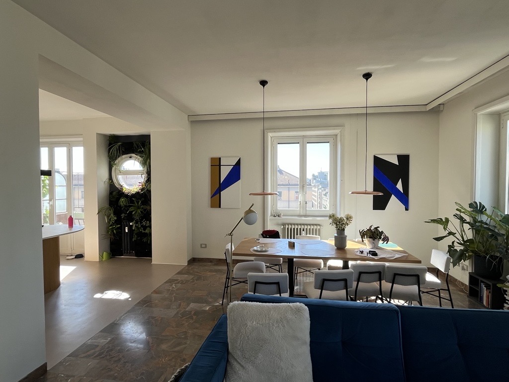 We honor original Milanese architectural elements like terrazzo floors and exposed beams while introducing Nordic functionality.